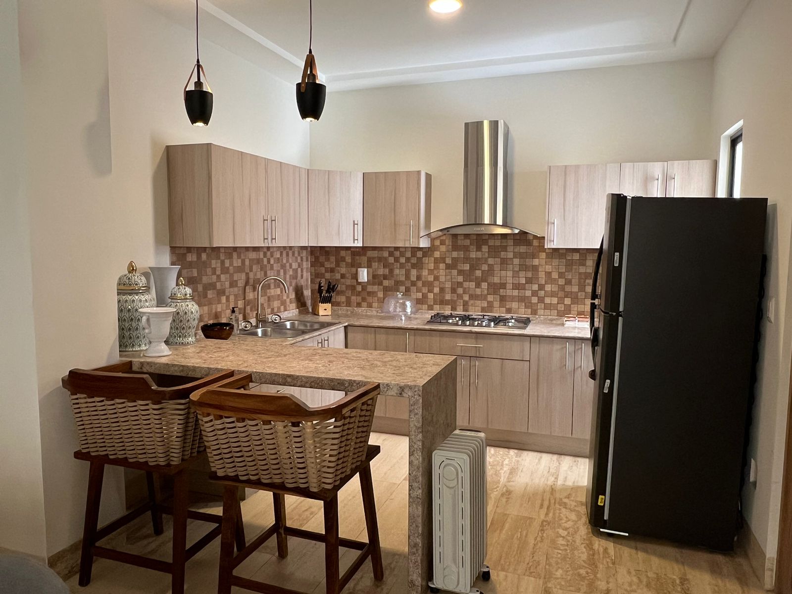 Estufa, refrigerador, utensilios, ollas y más, todo listo para preparar tus comidas.